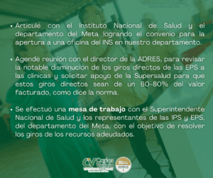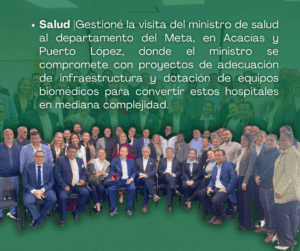 Gestioné la visita del ministro de Salud, al departamento del Meta, donde se comprometió con proyectos de infraestructura y dotación de equipos biomédicos para los hospitales de Acacías y Puerto López